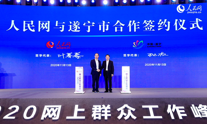 人民网遂宁11月13日电(郑会宇)11月12日—13日,2020网上群众工作峰会在四川遂宁举行。会上,人民网与遂宁市签订合作协议,人民网党委书记、董事长、总裁叶蓁蓁,遂宁市委副书记、市长邓正权出席签约仪式。
