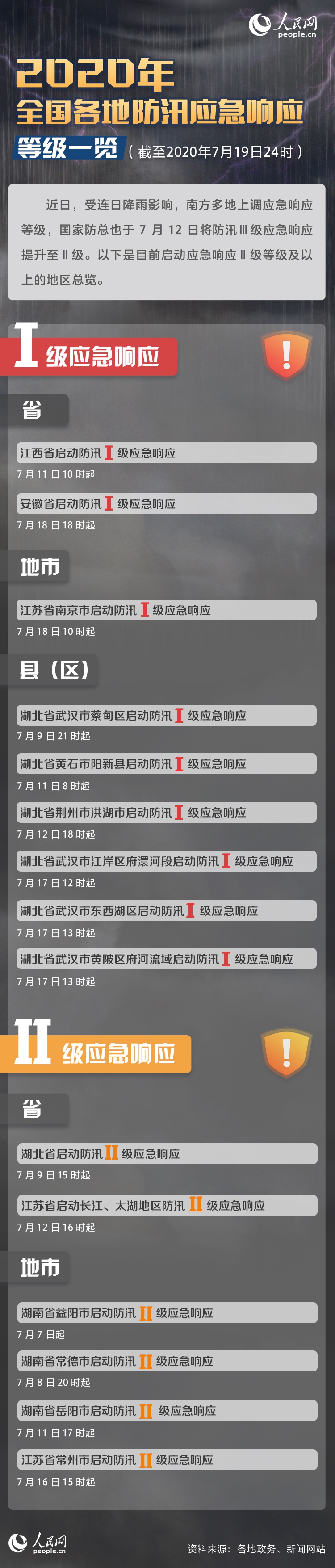 [网连中国]2020年全国各地防汛应急响应等级汇总 近日,受连日降雨影响,南方多地上调应急响应等级。7月11日10时起,江西省启动防汛Ⅰ级应急响应;7月18日18时起,安徽省启动防汛Ⅰ级应急响应;7月18日10时起,江苏省南京市启动防汛Ⅰ级应急响应……同时,国家防总也于7月12日将防汛Ⅲ级应急响应提升至Ⅱ级。以下是2020年全国各地防汛应急响应等级汇…