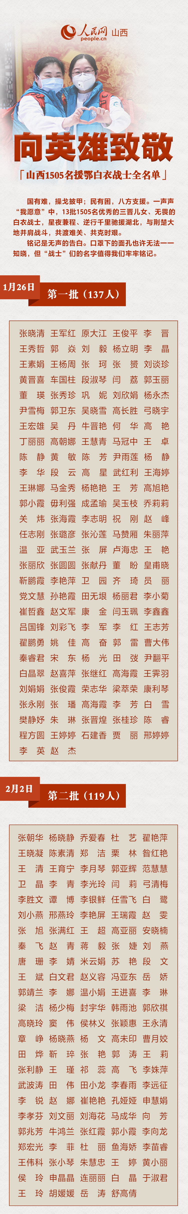 致敬!多省区市支援湖北医护人员全名单公布 国有难,操戈披甲;民有困,八方支援。 新冠肺炎疫情发生以来,在一声声“我愿意”中,各地医务工作者纷纷奔赴前线、驰援湖北。他们的面孔,我们或许无法知晓,但他们的名字,值得铭记。白衣战士们,愿你们早日平安回家! 天津 截至目前,天津先后派出十二批医疗队支援湖北。 人员名单 …