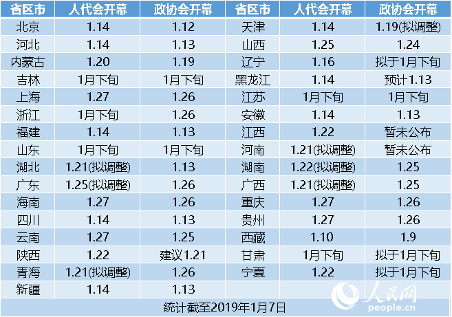 网连中国:西藏政协会1月9日召开 2019省级两会将拉开序幕 日前,西藏公布了2019省级两会召开时间:政协会将于1月9日召开,人代会将于1月10日召开。根据官方已公布的日程,西藏系2019年最早召开省级两会的省份,其余省区市将在接下来的一个月内陆续召开本省份两会。 注:资料来源于各省份日报,人大、政协网站或当地宣传部门,内容截至1月7日,实际时间以…