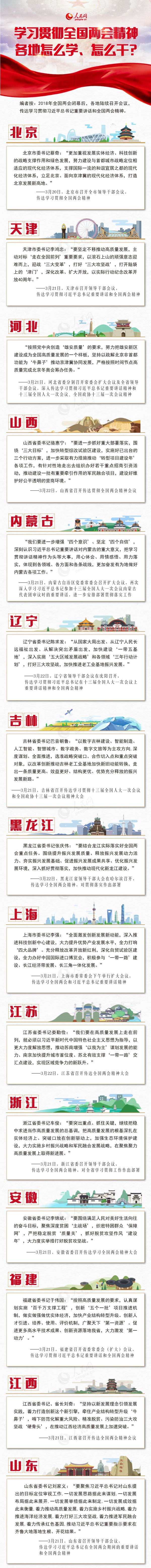 学习贯彻全国两会精神 各地怎么学、怎么干? 详细阅读: 【北京】北京市召开全市领导干部会议 传达学习贯彻全国两会精神 【天津】天津市召开领导干部会议:推动党中央决策部署在天津落地生根 【河北】河北省委召开常委会扩大会议及全省领导干部会议 【山西】山西省召开传达贯彻全国“两会”精神会议 【内蒙古】内蒙古自治区党委常委会召开扩…