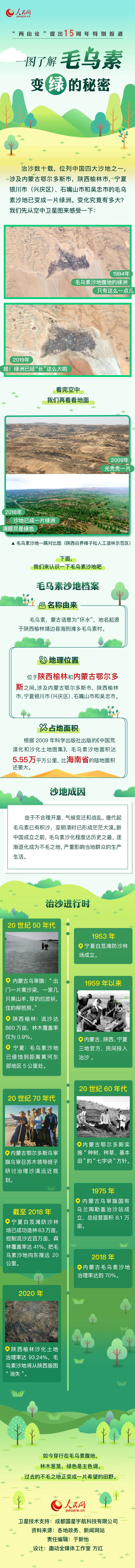 一图了解毛乌素变绿的秘密 横亘陕西、内蒙古、宁夏三地的毛乌素沙地,是我国四大沙地之一。昔日的毛乌素,黄沙漫天,“沙进人退”。新中国成立后,经过几代人数十年的治理,如今的毛乌素腹地,林木葱茏,绿色已成主色调。一图来了解毛乌素变绿的秘密↓↓↓ 点击进入专题查看更多 此前报道: “毛乌素变绿记”宁夏篇…