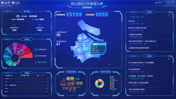 “网上群众工作智慧大屏”主屏幕可实时显示上海市下辖各区的具体网民留言量、回复量、回复率、满意度等数据,相关信息系人民日报社人民网建设的“领导留言板”所产生的实时数据,及各地各维度网上群众工作落实情况与舆情动向。未来,这些数据可为上海党委政府决策施政提供更多民意参考。