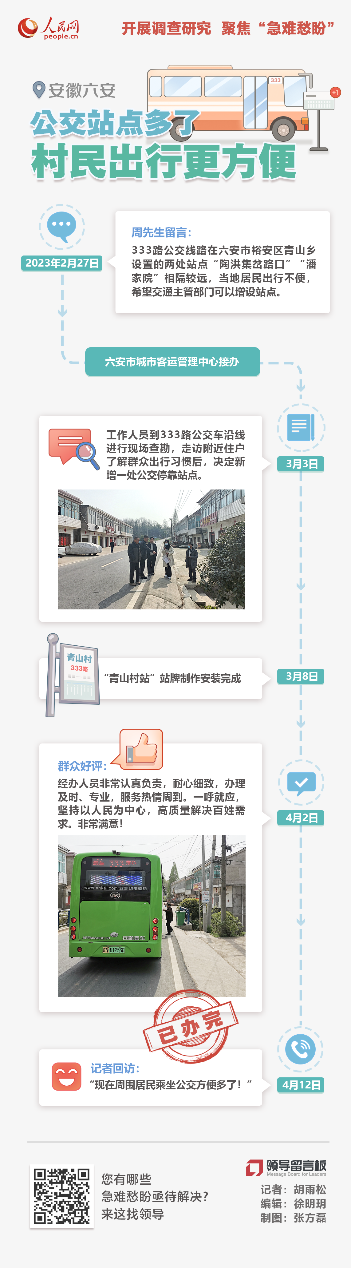 接到网友留言后,六安市城市客运管理中心立刻安排工作人员到333路公交车沿线进行现场查勘,调研走访附近住户,了解群众出行习惯。在与青山乡政府协商后,客运中心决定在563乡道上新增公交停靠站点一处,站名为“青山村”站,在今年3月8日完成站牌制作安装。