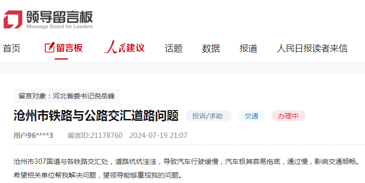 “沧州市307国道与各铁路交汇处,道路坑坑洼洼,导致汽车行驶缓慢,汽车极其容易拖底,影响交通顺畅。”2024年7月,有群众在人民网“领导留言板”上留言,希望维修307国道与各铁路交汇处的破损路面。