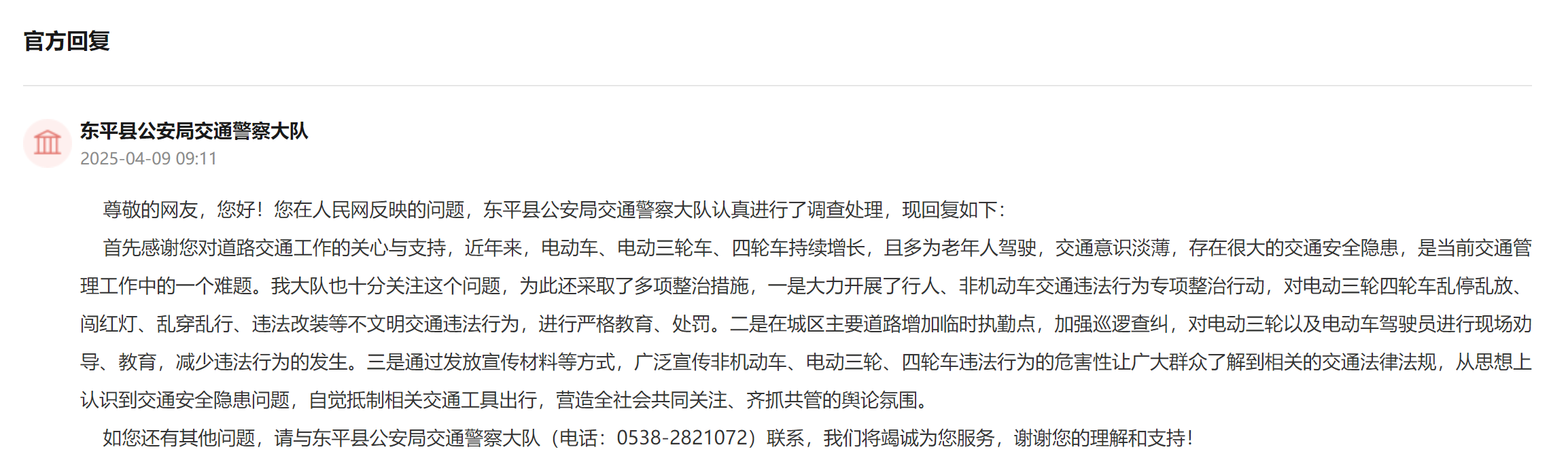 收到网友留言后,东平县公安局交通警察大队立即认真进行了调查处理。
